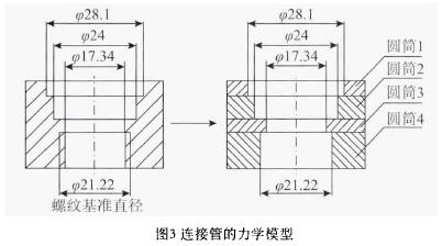隨著內(nèi)徑的變化,連接管實(shí)際上是由多個(gè)僅承受內(nèi)壓的圓筒堆積而成,如圖3所示,自上而下,連接管可以近似看作是由內(nèi)徑分別為¢18.1mm、¢24mm、¢17.34mm、¢21.22mm的4個(gè)圓筒粘接而成。