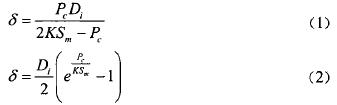 作用在筒壁上的工作壓力為50Mpa,設(shè)計(jì)壓力范圍在0.1Mpa~100Mpa之間,依據(jù)中華人民共和國(guó)行業(yè)標(biāo)準(zhǔn)JB4732-1995(2005年確認(rèn))《鋼制壓力容器一分析設(shè)計(jì)標(biāo)準(zhǔn)》中規(guī)定:當(dāng)設(shè)計(jì)壓力PC≤0.4KSm時(shí),按公式(1)確定壁厚;當(dāng)設(shè)計(jì)壓力PC>0.4KSm時(shí),按公式(2)確定壁厚。
