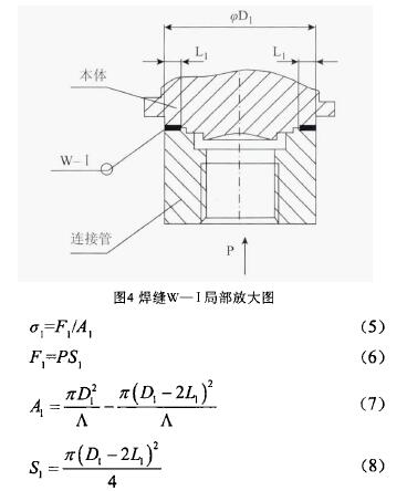 設(shè)焊縫W-I即本體和連接管焊接部的工作應(yīng)力為σ1,則其焊縫的強(qiáng)度條件為: