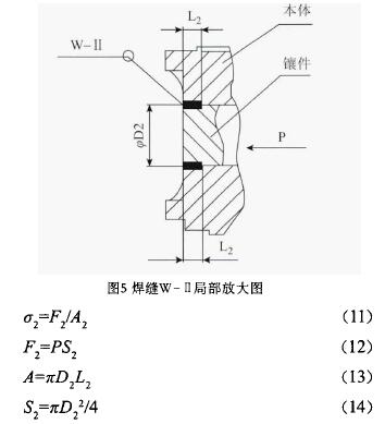 設(shè)焊縫w-II即本體和鑲件焊接部的工作應(yīng)力為σ2,則其焊縫的強(qiáng)度條件為: