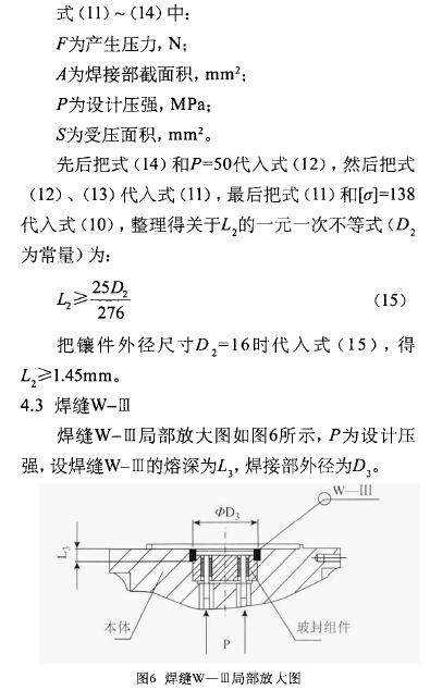 顯然,焊縫W-III即本體和玻封組件焊接部與焊縫W-II的結(jié)構(gòu)型式完全相似,所以計(jì)算方法完全相同。設(shè)焊縫W-III的熔深L3,焊接部外徑為D3,同理可得L3與D3的數(shù)學(xué)關(guān)系式為: