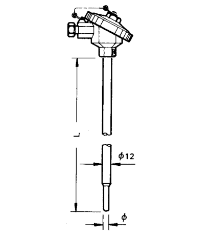 WZP-2312A(WZP-2316A、WZP-4312A、WZP-4316A)型裝配式熱電阻安裝固定裝置有固定螺紋、活動法蘭盤、固定安裝法蘭盤和帶固定螺栓錐形保護管裝置等形式。由于熱電阻傳感器采集溫度點在桿端部位置,為了保證熱傳遞采集速度以及檢測需要在傳感器的端部采用縮徑異徑測溫方式,一般桿端采用φ8mm或者φ6mm的測溫端。