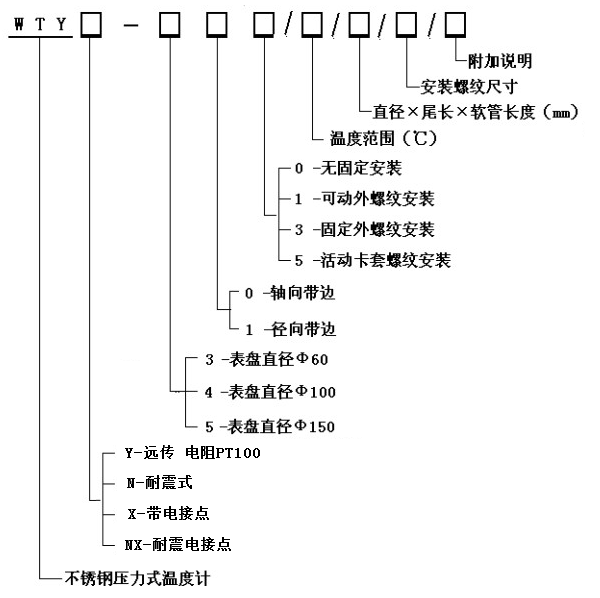 WTY系列不銹鋼壓力式溫度計是采用液體膨脹原理使溫度計測量元件偏轉而帶動指針指在刻度盤對應的溫度數值上而顯示被測液體、氣體的溫度的。由于其溫包體積小、抗震動、靈敏度高、壽命長、安裝方式多樣等優點,被應用于石油化工、機械、制藥、食品、船舶等生產過程中的檢測和控制。